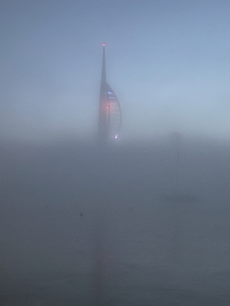 I’ve quite often seen the Spinaker in this state. There have been times when the fog has been so thick that the whole tower has been completely obscured. Conversely, on occasion I have seen the bottom of the tower obscured, and the top visible as here;