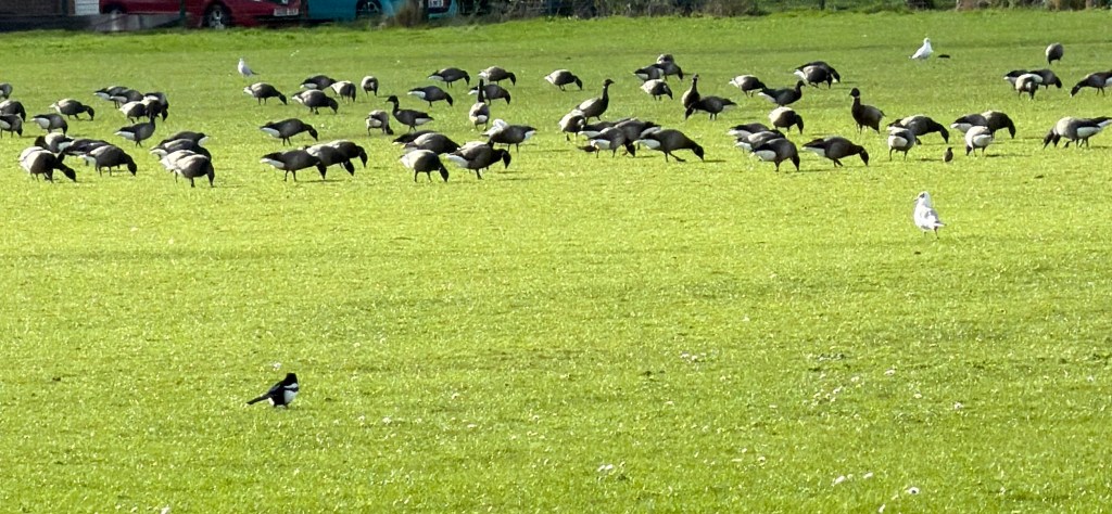 Well, this is finishing off the day. When I lefft the shed, I found that geese had all left Forton Creek and had moved on to a local field. I hadn’t noticed the magpie and gull outlayers when I took the picture. I wonder what they were waiting for? It didn’t seem like the pickings would be that rich.