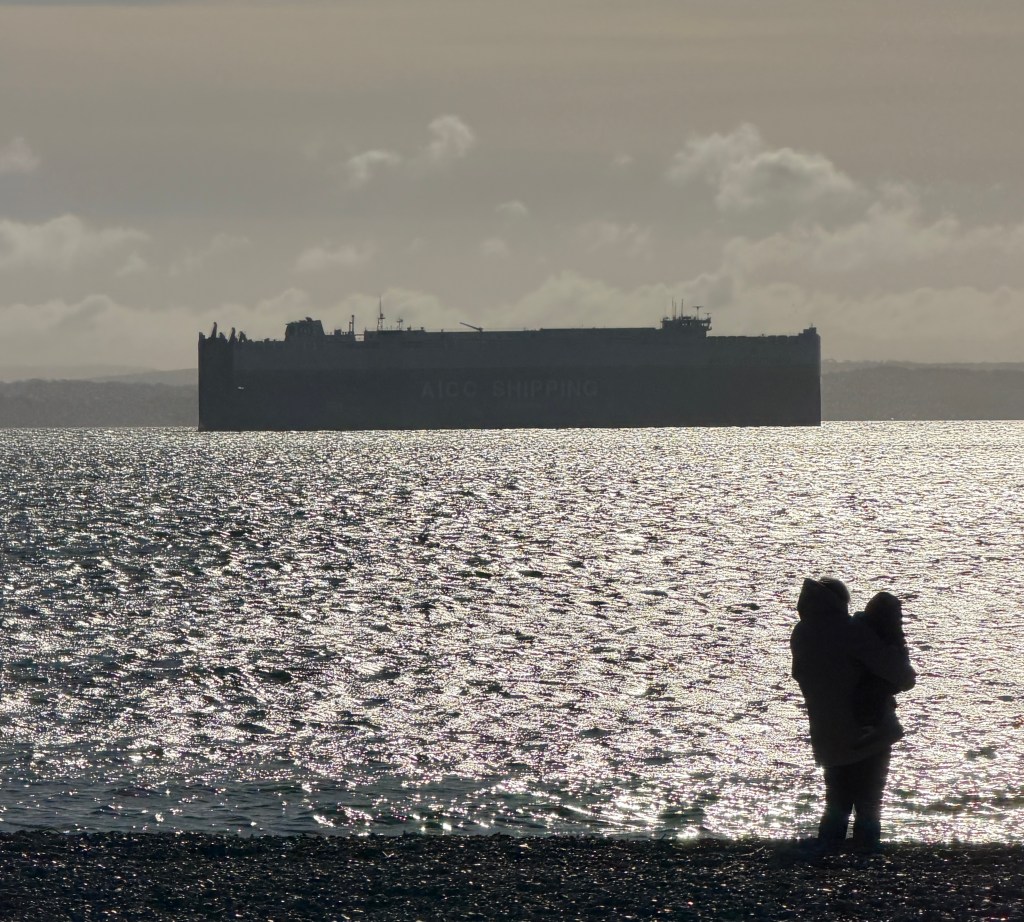 The header picture? The silhouetted rather blocky ship is the AICC Fenghuang, a car carrier, with the capacity of 7,000 cars. The two people looking out over the water, are Elayne and Aurora.