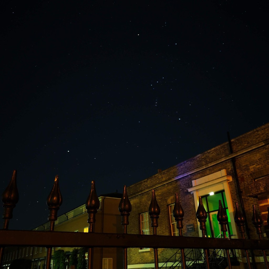 There’s a point in my walk, where I can leave the normal pavement and go only 3 or 4 yards to one side, where the spot is sheltered from street lights. There is still ambient light obviously, but as this picture shows, Orion & Sirius are quite clear. This is a 20 second exposure with the sensor set at ISO 50. I like that you can see the sword of Orion as individual objects. I’ll have another go.