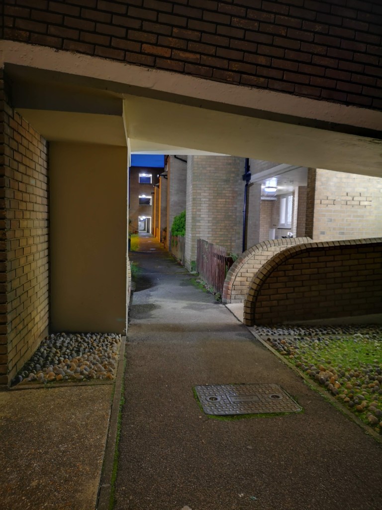 The building is White Lion Walk It’s quite long, I had to resort to Google Maps to measure it at about 393 feet, or 131 yards, or 120 metres. The only other fact I can establish is that was either built 34 years ago or, as seems more likely in the 1960’s. Things seem a bit uncertain, and I’m having no luck tracking down information on the Internet (admittedly, I’ve only tried for about 10 minutes). Lots of information about flats for sale, but that’s it.