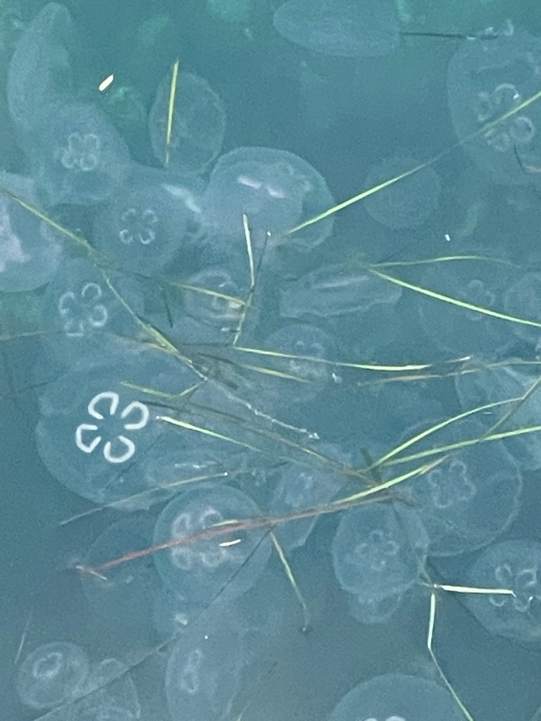 There were thousands of jelly fish in the cockle pond this morning, a swarm of them. I’ve written a lot about them. I’ve also written a lot about the photographs I’ve taken this week. I’ve also written a lot about the birds. I’ve enjoyed writing about them. But I don’t think the writing has been very good.
