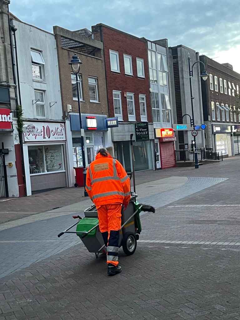 The gentleman in the picture is one of the street cleaners (OK, so that’s stating the obvious). I said good morning to him, and he then took the opportunity to ask me what I was up to. He was quite interested. I took the opportunity to thank him for keeping the streets of Gosport clean.