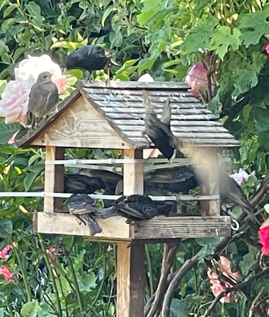 This time of year we get baby starlings. There were 2 this evening trying to eke out food. I reloaded the table. It’s strange isn’t it? I feel guilty at deriving pleasure & particularly entertainment from something that is just hungry and needs food. Earlier today I was watching the table. There were birds perched on all four sides, and one in the centre with the food. It was defending its store, and attacking anything that attempted to grab a bite. In the end they kind of just piled in and overwhelmed the defender of food.