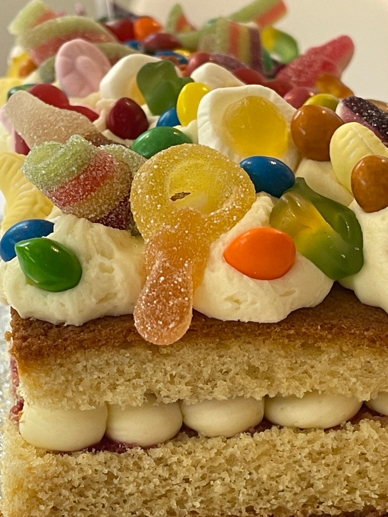 The picture is of the birthday cake at the party we went to today. The cake was a Victoria sponge with icing and haribo types sweets all over it. To be honest it looked both disgusting and fascinating and an absolute sugar nightmare. I would have had a second slice if there were enough left, it was delicious!
