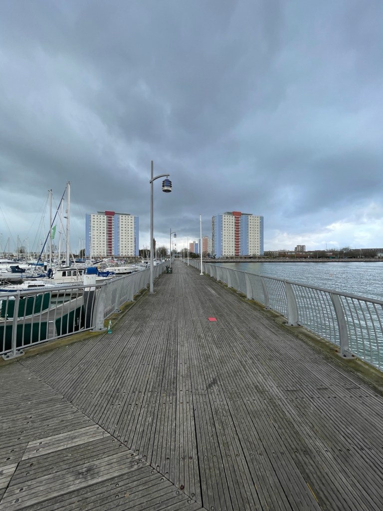 Elayne sat down for a bit whilst I walked out to the end of the Haslar Marina Pier Wall, where I took today’s photo, and as I started walking back, it began to rain fairly heavily. I really appreciated my new waterproof coat, which I had bought in Dorchester earlier in the week. We sat for a few minutes under the umbrella, just enjoying being out and dry, sheltered from what was a really quite chilly wind.