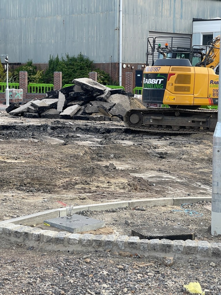 It’s not that things are taking shape, more that things are being taken apart. Very large chunks of tarmac being piled up so that the base for the new bus station can be laid down.