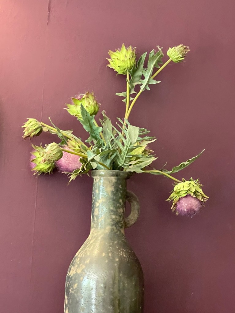 The picture is of a vase that was in the pub where we had lunch after the camera club walk. There was something about it, possibly the contrast of the background colour against the unusual choice of flowers. It all fits actually quite well.