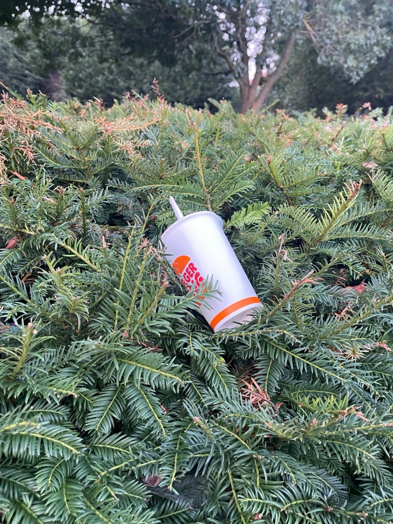 A Burger King cup discarded in the hedge between Trinity Church and the Millennium sundial at the waterfront.