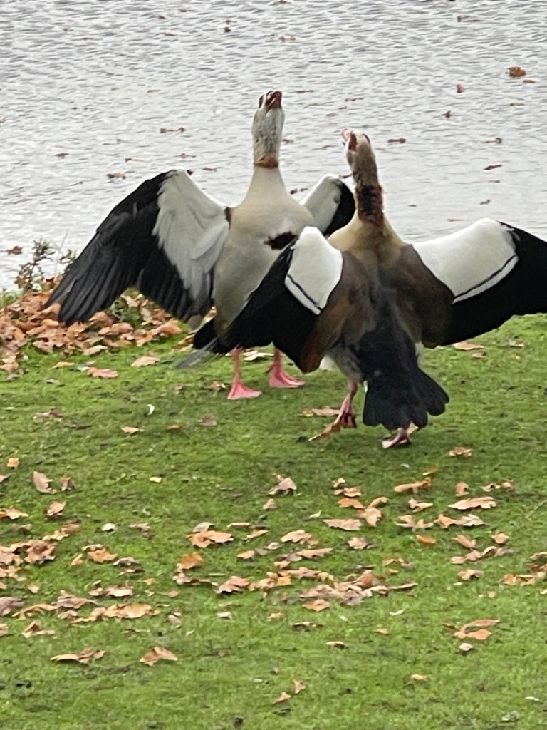 We went for a lovely walk this morning, not too far, but there was loads of wildlife, especially birds, these Egyptian Geese were puttering on a bit of a display for us.\