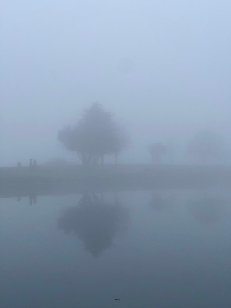 When Misty jumped on the bed at about half past 4 this morning, she was slightly damp, not drenched, so I thought that it might be raining lightly. No, not raining at all, there was quite a thick fog. I got up for my walk.