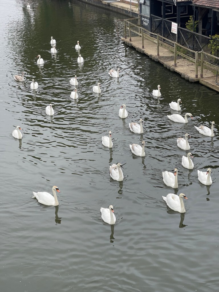 It turns out that a few swans I called a bevy. A lot of swans is called a bank. A group of swans in flight is called a wedge. I’m going to guess that around 40 or more swans is at least a bank.