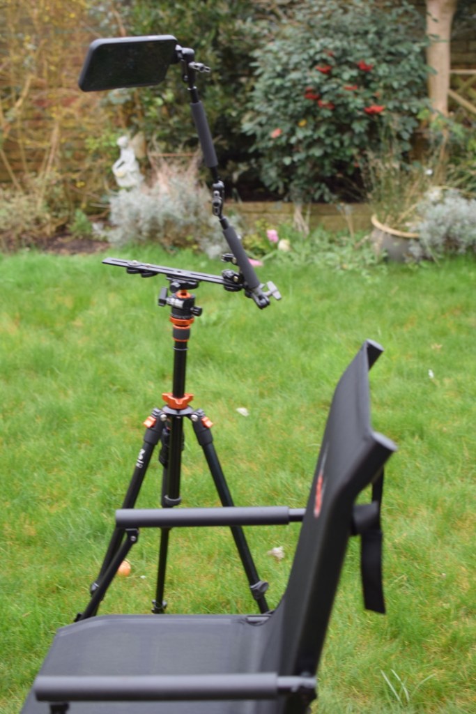 Of course, it hasn’t worked. Even with a fairly solid tripod like mine, the use of the articulating arm to hold the phone over the chair throws the centre of gravity of the arrangement way off so that even with only a gentle touch, it topples.