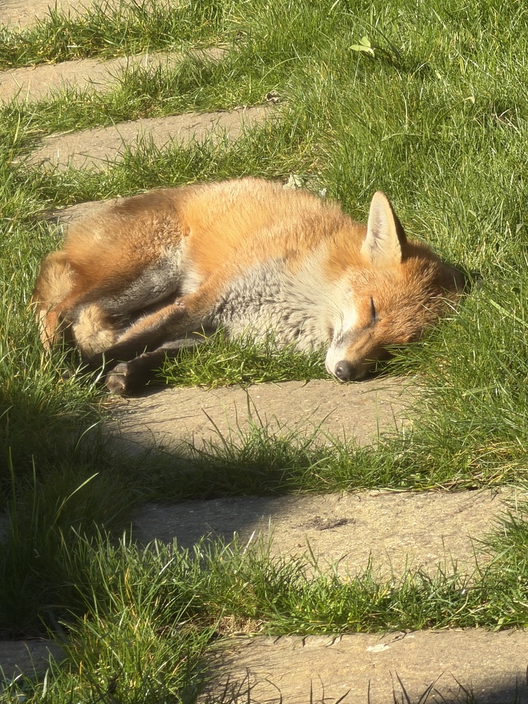 For some reason, one of the local foxes, we think it’s a vixen. has taken a real shine to our garden. It seems able to be sufficiently relaxed that it it is happy to fall asleep for several hours. We’ve seen it curled up on the rockery, in the middle of the lawn, and here today on the garden path.