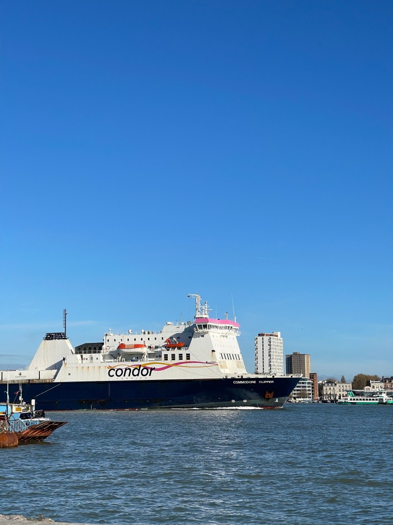 I stood for a couple of minutes at the waterfront, next to the ferry terminal. The tide was in, there was no slope on the ferry ramp. There was a small, slightly strange boat black on the body, yellow superstructure. Very small, I don’t know if it was an official craft. Or just colourful.