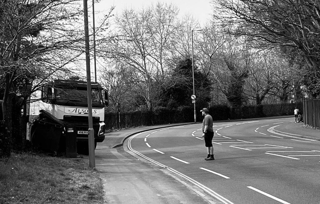 What is difficult to see toward the front offside of the lorry is a large mobile bin in front of a telecoms box which the lorry has to negotiate past.