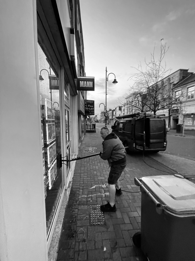 It was on the second pass that I saw the window cleaner. Now, I have seen him numerous times before, but have never spoken to him. This morning I asked if he would mind if I took his picture. I explained that I wanted to do a photography project featuring working people, he was more than happy. When I see this the next time, hopefully in the morning, I really must ask him his name and give him a card. He wasn’t there on my first pass down the High Street.