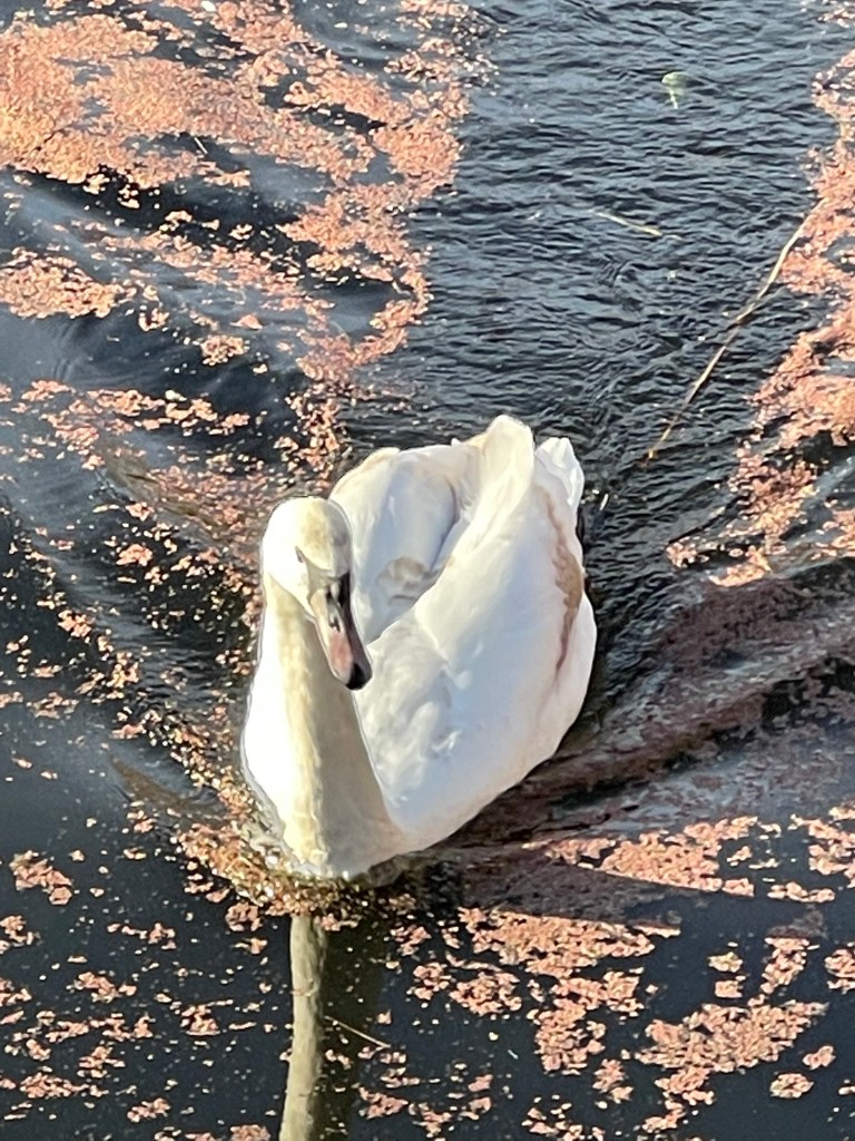 I don’t know what the stuff is that these (I think they are Tufted Ducks) are swimming through, but they don’t seem disturbed by it, and some of the birds were swimming through it and hoovering it up, so it looks like it might be beneficial.