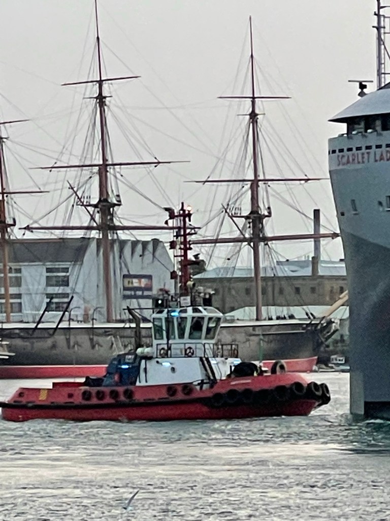 The Scarlet Lady, the aptly named Virgin Cruise Ship is not a small vessel. It looks like the tug is about to get run over. But when you see them in action you begin to appreciate not only the power of these little vessels, but the consummate mastery with which they are captained. It was stationary, The Scarlet Lady was heading right for it, and the tug just started scooting backwards, the power and agility of these little craft make watching them at work an absolute delight.