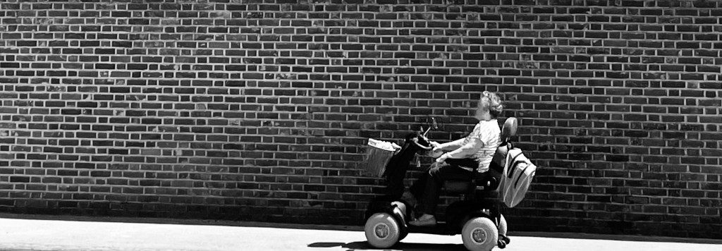 Street photography is still figuring in my mind. I took this picture on my lunchtime walk, and I must admit, I debated whether or not to post it. I didn’t want people to think I was taking advantage. Something about the contrast between the mobility scooter and the brick wall just caught my attention.
