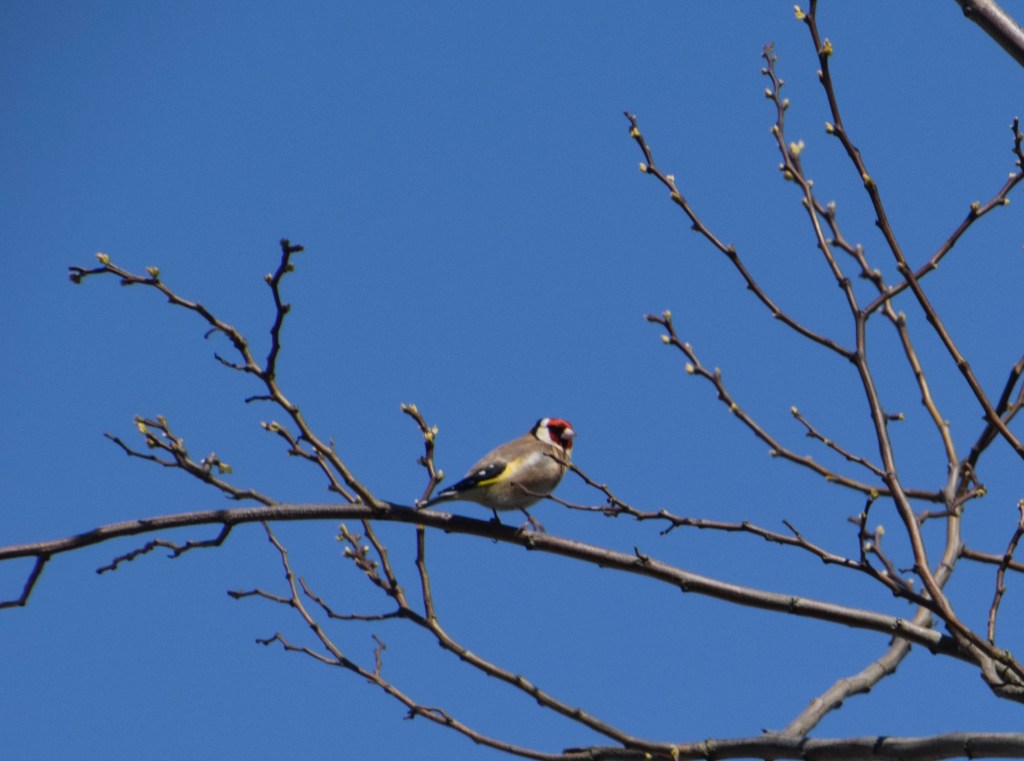 The Goldfinch in the picture has been with us for a couple of days now. I’m told it does come down for food. I’ve been watching it this afternoon. It would come from one direction, sit in the tree for five minutes or so, making an extremely loud but very musical racket, and then fly off pretty much at 90 degrees to it’s arrival path. A few minutes later it would be back again.
