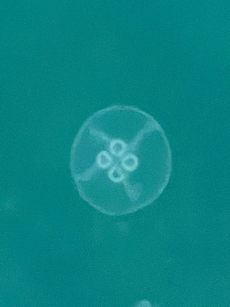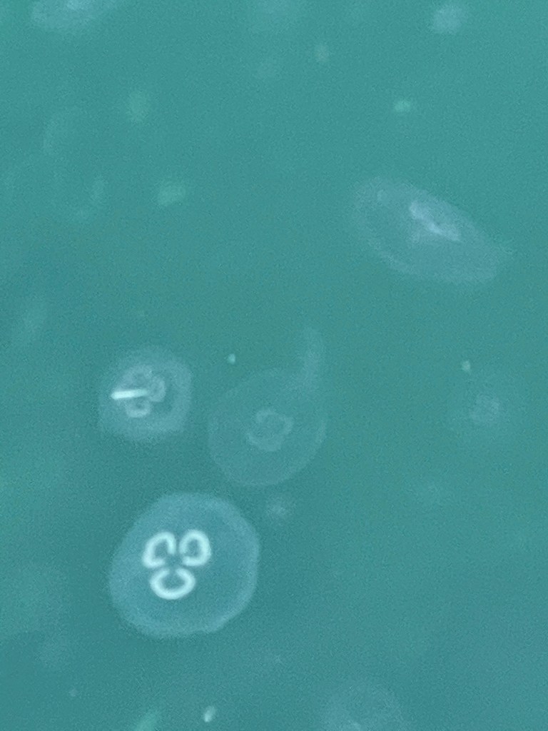 Almost a week ago I wrote a piece on birds, I really enjoyed writing that. I should also have done more research on the Jelly Fish, and will do so. I’ve started walking past them every morning to see how they are doing. This morning, they were all clumped together on the south western side. Some of them are very small, others are around three to four inches. I’m going to keep an eye on them.