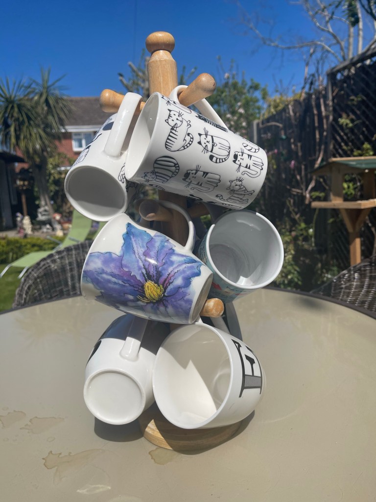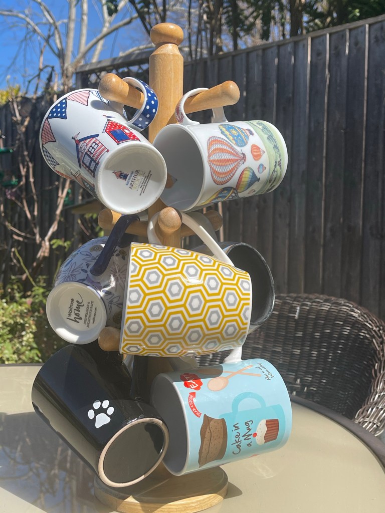 We have this cup holder. It’s been causing me problems. Why is that? You might unreasonably ask. Well, our cups tend to come in pairs. There are three hooks at each level. It just doesn’t work. I had thoughts of keeping any pairs off the stand. That doesn’t work, you pretty much always end up with at least one pair.